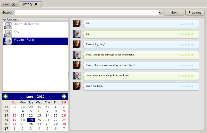 Local history support is beginning to take shape. Using a sqlite database, the client now logs outgoing or incoming messages. The database API is similar to the functionality provided by xep-0313, making the implementation of the remote archiving support a simple matter of synchronization. Users are able to browse through their logs, though searching is not yet available.